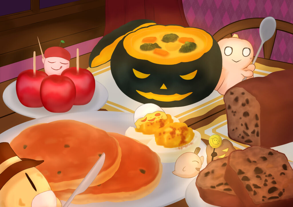 ハロウィンイラスト2019。今度はマスコットと食べ物イラストで攻める。新たなおばけも複数誕生。