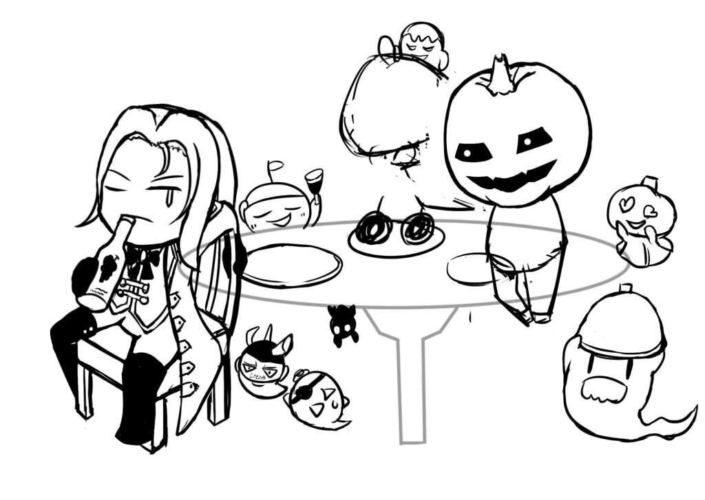 これは初公開じゃないかな、ハロウィンイラストで生まれたキャラたちによる宴。しかし途中で力尽きて没絵に。今は吸血鬼メイド(男の娘)もいるんですがね。